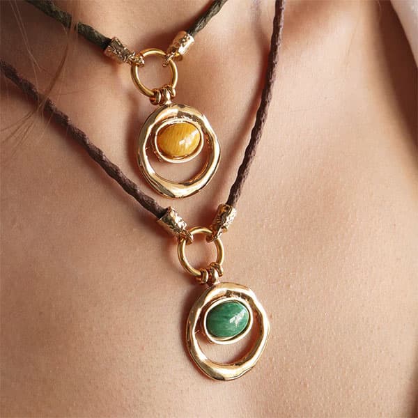 Este collar Siabann corto para mujer, elaborado a mano en España, es una pieza única y versátil que se adapta a cualquier ocasión. Con un cordón premium de alta calidad y una pieza circular dorada, en el centro destaca una hermosa piedra natural que aporta un toque de frescura y sofisticación.