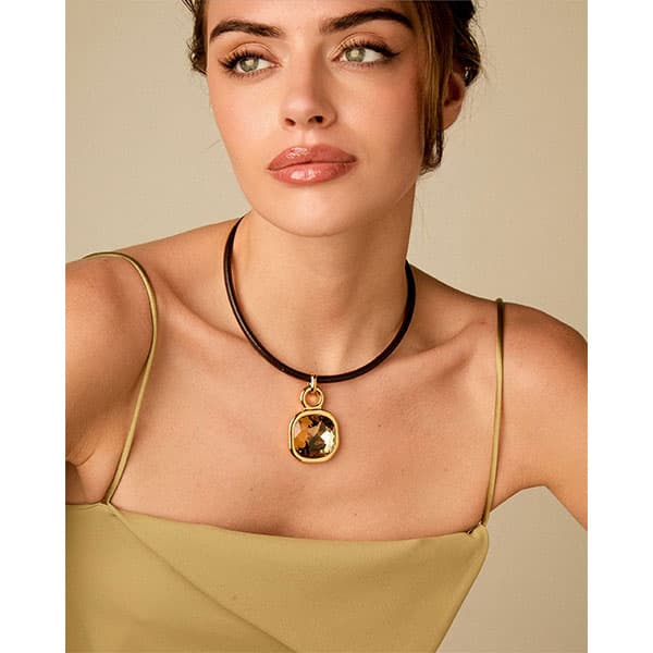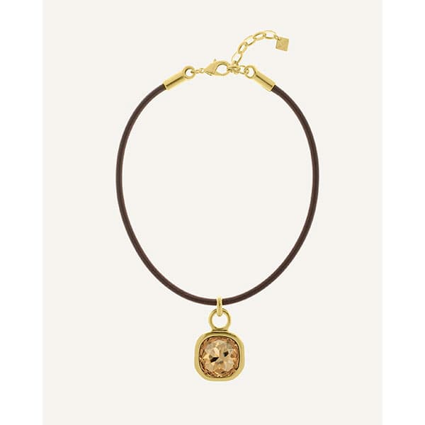 Collar corto de cordón de cuero grueso con un colgante cuadrado colgando de una anilla redonda. El colgante presenta un gran cristal Swarovski® cuadrado.